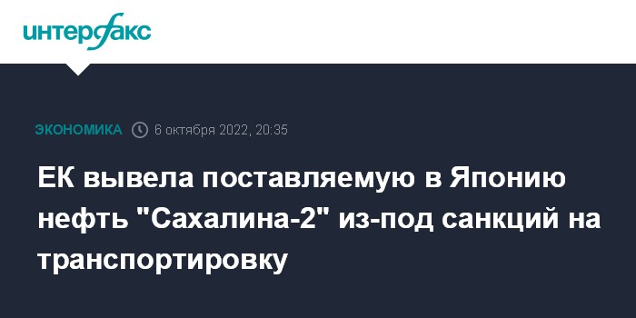 Москва. 6 октября. INTERFAX.RU - Нефть проекта "Сахалина-2", смешанная с конденсатом, исключена из санкций ЕС на транспортировку и соответствующие услуги при поставке в Японию сроком до 5 июня 2023 года, следует из опубликованного 8-го пакета санкций Евросоюза в отношении России.