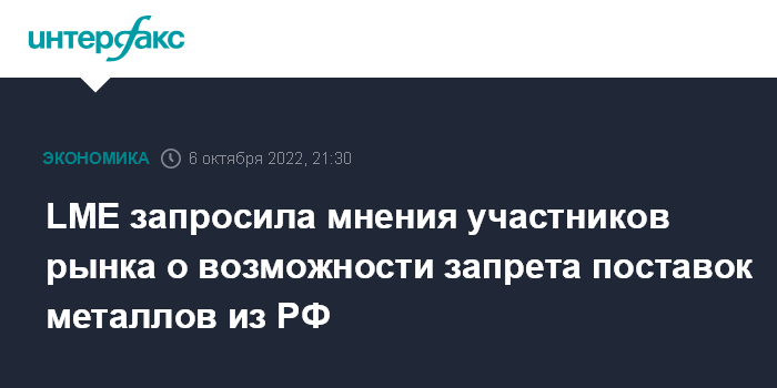 Москва. 6 октября. INTERFAX.RU - Лондонская биржа металлов (LME) запросила мнения участников рынка относительно возможности запрета поставок российских металлов.