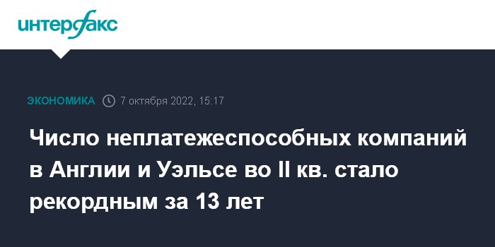 Москва. 7 октября. INTERFAX.RU - Количество неплатежеспособных компаний в Англии и Уэльсе во втором квартале текущего года достигло максимального уровня с 2009 года на фоне роста цен на энергоресурсы, ослабления спроса и увеличения стоимости заимствований, пишет газета Financial Times.