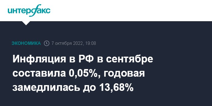 Годовая инфляция, по данным Росстата, в сентябре замедлилась до 13,68% (аналитики ожидали замедления до 13,6%) с 14,30% на конец августа, 15,10% в июле, 15,90% в июне, 17,10% в мае и 17,83% в апреле (это был максимум с января 2002 года).