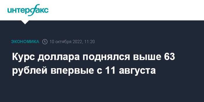 Москва. 10 октября. INTERFAX.RU - Утром в понедельник на "Мосбирже" курс доллара США поднялся выше 63 рублей впервые с 11 августа, евро дорожает к уровню 62 рубля.