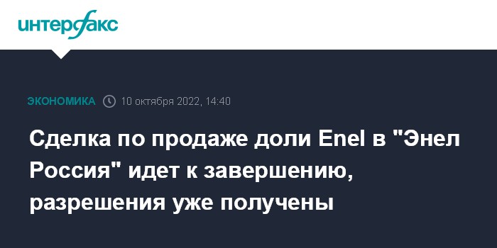 Москва. 10 октября. INTERFAX.RU - Сделка по продаже доли итальянского энергохолдинга Enel в ПАО "Энел Россия" (ENRU) идет к завершению, все необходимые разрешения, в том числе от Федеральной антимонопольной службы, уже получены, сообщила "Интерфаксу" через своего представителя гендиректор "Энел Россия" Жанна Седова.