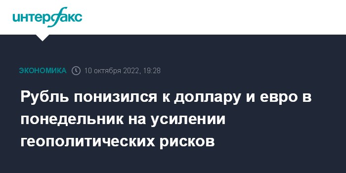 Как отмечают эксперты "Интерфакс-ЦЭА", рубль подешевел к доллару и евро в понедельник, инвесторы активно выходили из рисковых активов на фоне усиления геополитический напряженности вокруг российско-украинского конфликта из-за подрыва части Крымского моста в субботу, 8 октября. Следственный комитет России возбудил по этому поводу уголовное дело по статье "Терроризм".