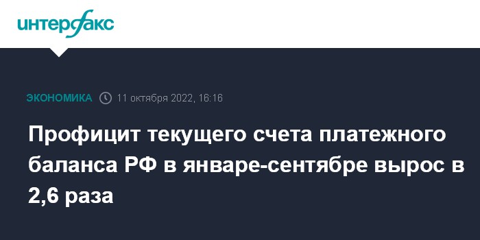 Москва. 11 октября. INTERFAX.RU - Положительное сальдо счета текущих операций платежного баланса РФ в январе-сентябре 2022 года составило $198,4 млрд, что в 2,6 раза больше, чем за аналогичный период 2021 года ($75,2 млрд). Такая информация содержится в оценке платежного баланса РФ, опубликованной на сайте Банка России.