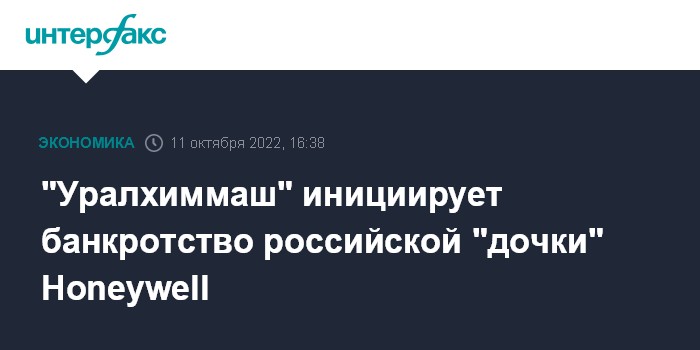 Москва. 11 октября. INTERFAX.RU - ПАО "Уралхиммаш" планирует обратиться в Арбитражный суд Москвы с заявлением о признании несостоятельным АО "Хоневелл" (принадлежит американской корпорации Honeywell, которая весной объявила об уходе из России), сообщается в материалах на "Федресурсе".
