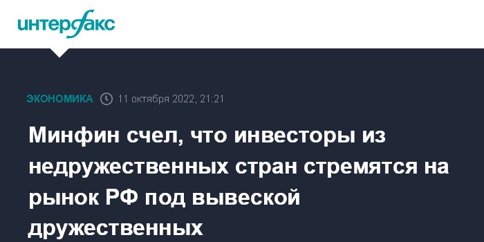 Москва. 11 октября. INTERFAX.RU - Иностранные инвесторы из "недружественных" стран уже ищут пути выхода на российский рынок, и скоро мы увидим их под вывеской дружественных, полагает замминистра финансов РФ Алексей Моисеев.