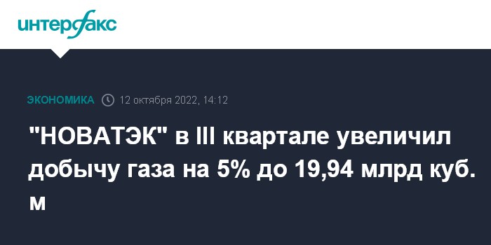Москва. 12 октября. INTERFAX.RU - "НОВАТЭК" в третьем квартале 2022 года увеличил добычу природного газа на 4,9% по отношению к июлю-сентябрю 2021 года - до 19,94 млрд куб. м, сообщила компания.