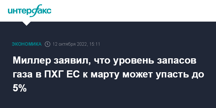 Москва. 12 октября. INTERFAX.RU - Данные о запасах газа в подземных хранилищах газа ЕС надо оценивать в контексте изменившейся логистики, нагрузка на них возрастет, к марту уровень запасов в ПХГ Европы может упасть до 5%. Такое мнение высказал глава "Газпрома" Алексей Миллер в ходе сессии Российской энергетической недели.