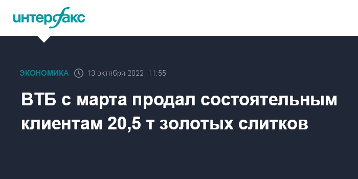 Москва. 13 октября. INTERFAX.RU - ВТБ с начала старта продаж в марте текущего года продал состоятельным клиентам 20,5 тонны золотых слитков, сообщил банк.
