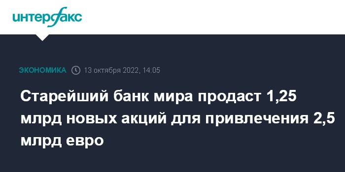 Старейший банк мира продаст 1,25 млрд новых акций для привлечения 2,5 млрд евро