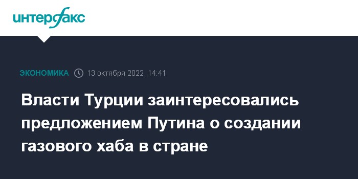 Москва. 13 октября. INTERFAX.RU - Анкара заинтересовалась предложением о создании в Турции газового хаба, и президенты двух стран Владимир Путин и Реджеп Тайип Эрдоган поручили оперативно проработать этот вопрос, заявил пресс-секретарь главы российского государства Дмитрий Песков.