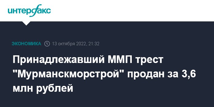 Москва. 13 октября. INTERFAX.RU - ООО "Трест Мурманскморстрой", дочерняя компания АО "Мурманское морское пароходство" (ММП, находится в процедуре банкротства), продано на открытых торгах посредством публичного предложения, говорится на сайте электронной площадке "Вердиктъ". Итоги аукциона подвели 13 октября.