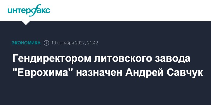 Москва. 13 октября. INTERFAX.RU - Главой кедайнского завода фосфорных удобрений Lifosa (Литва), входящего в "Еврохим" и приостановившего работу из-за санкций, назначен бывший топ-менеджер "Еврохима" Андрей Савчук, сообщила Lifosa.