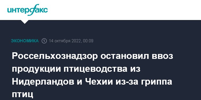 "Обеспокоенный таким положением дел Россельхознадзор запросил материалы, подтверждающие эффективность системы ветеринарного контроля за распространением болезни, у компетентных органов ряда стран ЕС со сроком предоставления до конца сентября 2022 года. В связи с отсутствием ответов от ветеринарных служб Нидерландов и Чехии, а также гарантий обеспечения безопасности поставок птицеводческой продукции, Россельхознадзор с 14 октября 2022 года вынужден приостановить ввоз из этих стран на территорию России инкубационных яиц и других птицеводческих товаров", - говорится в сообщении.