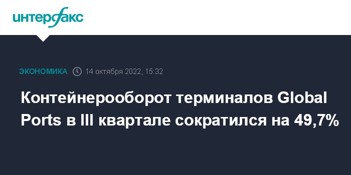 Москва. 14 октября. INTERFAX.RU - В III квартале 2022 года консолидированный контейнерный оборот морских терминалов Global Ports сократился на 49,7% в годовом исчислени и, до 202 тысяч TEU, сообщила компания.