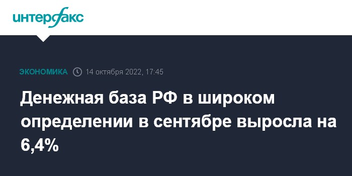 Москва. 14 октября. INTERFAX.RU - Денежная база РФ в широком определении в сентябре 2022 года увеличилась на 1 трлн 265,4 млрд рублей, или на 6,4%, до 21 трлн 95,5 млрд рублей. Такие данные содержатся на сайте Банка России.