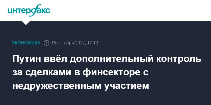 Согласно указу, который опубликован в субботу на официальном портале правовых актов, сделки и операции, влекущие за собой прямо и косвенно установление, изменение или прекращение прав на более чем 1% акций/долей в уставном капитале банка, страховой организации, негосударственного пенсионного фонда, микрофинансовой компании либо управляющей компании акционерного инвестиционного фонда, паевого инвестиционного фонда или негосударственного пенсионного фонда, осуществляются на основании разрешения правительственной комиссии по контролю за осуществлением иностранных инвестиций в РФ. Такое разрешение необходимо, если хотя бы одной из сторон сделок являются иностранные лица, связанные с недружественными государствами.