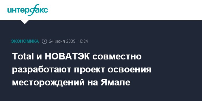 Москва. 24 июня. INTERFAX.RU - Total и "НОВАТЭК" совместно разработают проект освоения месторождений на Ямале, сообщил премьер-министр РФ Владимир Путин на встрече с главой французской НК Total Кристофом де Маржери и председателем правления "НОВАТЭКа" Леонидом Михельсоном. По словам Путина, речь идет о разработке Термо-Карстового месторождения.