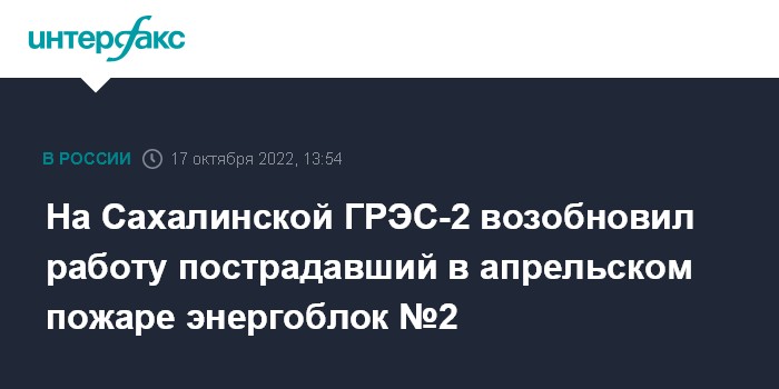 Москва. 17 октября. INTERFAX.RU - ПАО "РусГидро" завершило ремонт и вернуло в эксплуатацию энергоблок №2 Сахалинской ГРЭС-2, который весной пострадал при пожаре. Ремонт завершен по графику, сообщила энергокомпания.