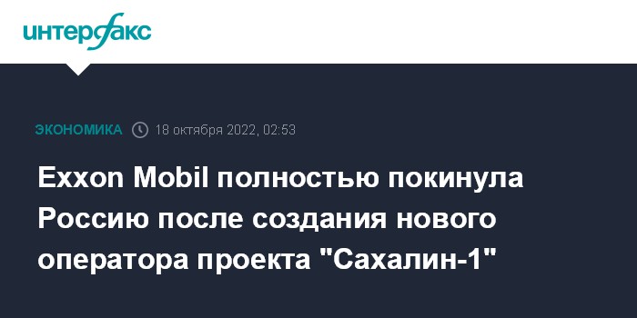 Москва. 18 октября. INTERFAX.RU - Американская Exxon Mobil полностью покинула Россию после создания нового оператора СРП-проекта "Сахалин-1", сообщили "Интерфаксу" в пресс-службе компании.
