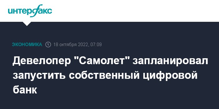 Москва. 18 октября. INTERFAX.RU - Девелопер "Самолет" планирует запустить собственный цифровой банк.