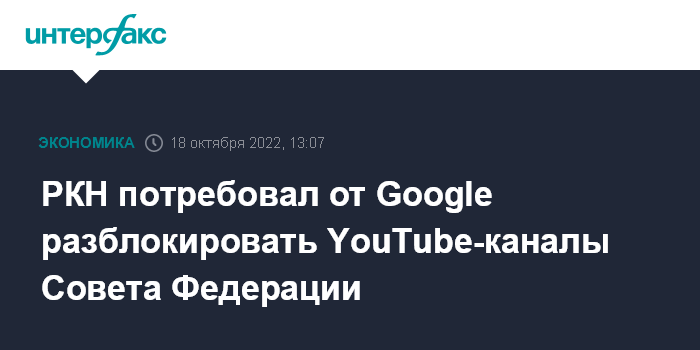 "Роскомнадзор потребовал от американской компании Google LLC, владеющей интернет-сервисом YouTube, незамедлительно восстановить доступ к официальным каналам Совета Федерации Федерального Собрания РФ на видеохостинге", - говорится в сообщении ведомства, поступившем во вторник в ответ на запрос агентства.