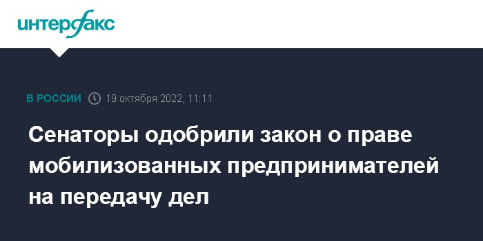 Москва. 19 октября. INTERFAX.RU - Совет Федерации одобрил закон, который даст пять рабочих дней индивидуальным предпринимателям и учредителям компаний, призванным по мобилизации, на решение оргвопросов и передачу дел доверительному управляющему.