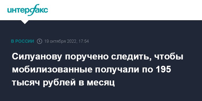 Президент Владимир Путин ранее этот день поручил Минобороны и Минфину установить для мобилизованных граждан выплаты в размере не менее 195 тысяч рублей за календарный месяц со дня зачисления в списки личного состава воинской части. Поручение должно быть выполнено к 1 ноября.