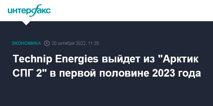 Москва. 20 октября. INTERFAX.RU - Французская Technip Energies (лидер ЕРС-подрядчика "Арктик СПГ 2", включающего также итальянскую Saipem и российский "НИПИГАЗ") продолжает выход из проекта, расформировала с проекта весь эксплуатационный персонал, говорится в ее отчетности за III квартал 2022 года.