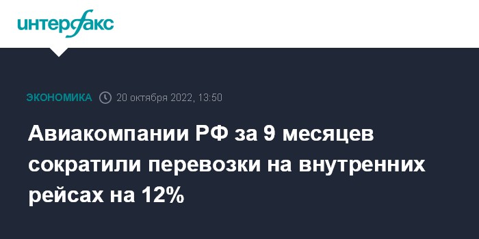 Москва. 20 октября. INTERFAX.RU - Российские авиакомпании в январе-сентябре 2022 года сократили перевозки на внутренних линиях на 11,9%, до 60 млн человек, сообщил заместитель руководителя Росавиации Владимир Потешкин в ходе круглого стола по развитию региональных авиаперевозок в Совете Федерации в четверг.