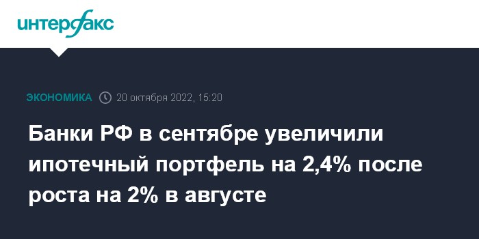 Москва. 20 октября. INTERFAX.RU - Российские банки в сентябре увеличили ипотечный портфель на 2,4% (в августе +2%), что выше среднемесячного уровня 2021 года, говорится в обзоре ЦБ о динамике развития банковского сектора.