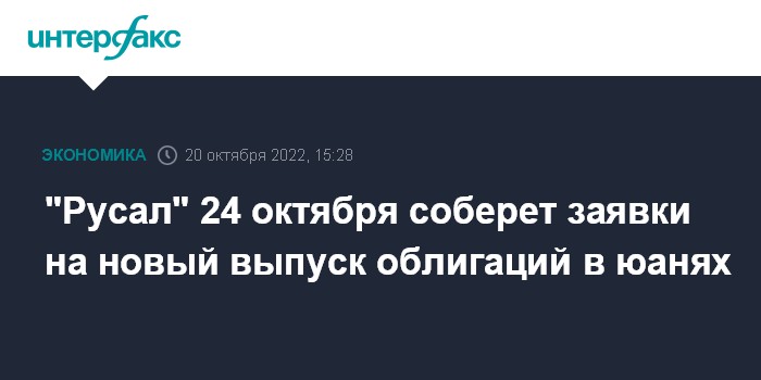 Москва. 20 октября. INTERFAX.RU - МКПАО "ОК Русал" 24 октября планирует собрать заявки на новый выпуск облигаций в юанях, сообщил "Интерфаксу" источник на финансовом рынке.