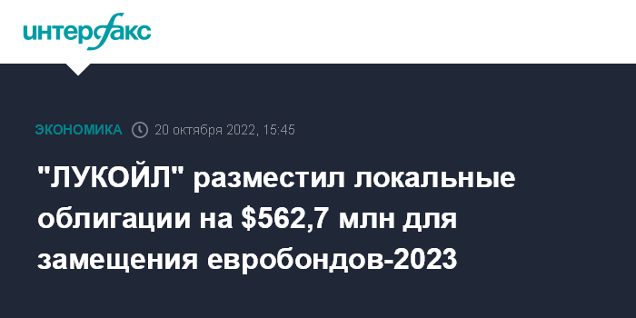 Москва. 20 октября. INTERFAX.RU - "ЛУКОЙЛ" разместил "замещающие" облигации на $562,7 млн в рамках обмена еврооблигаций с погашением в 2023 году на локальные долговые бумаги.