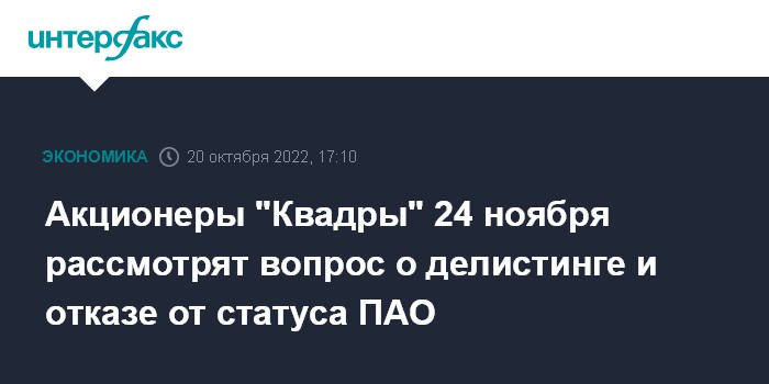 Акционеры "Квадры" 24 ноября рассмотрят вопрос о делистинге и отказе от статуса ПАО