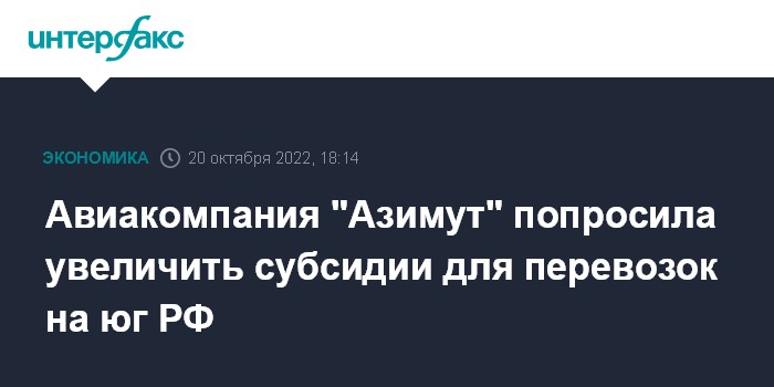 Москва. 20 октября. INTERFAX.RU - Авиакомпания "Азимут" предложила увеличить субсидии для перевозок на юг РФ в связи с удлинением маршрутов из-за ограничения полетов в этой части страны.
