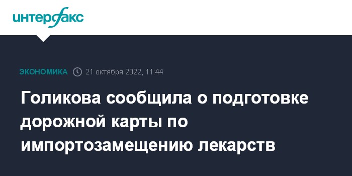 Москва. 21 октября. INTERFAX.RU - Правительство подготовило дорожную карту по импортозамещению лекарственных препаратов, аналогичная дорожная карта готовится по медицинским изделиям, сообщила вице-премьер Татьяна Голикова.