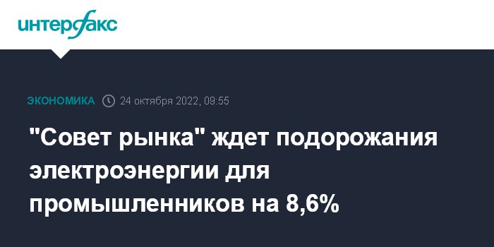 Москва. 24 октября. INTERFAX.RU - Ассоциация "НП "Совет рынка"" ожидает увеличения цены на электроэнергию для промышленных потребителей в следующем году на 8,6% (совокупно по ценовым зонам), пишет "Коммерсантъ" со ссылкой на материалы НП.