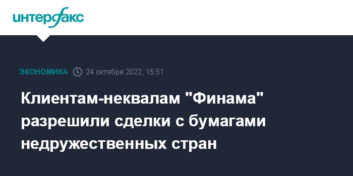Москва. 24 октября. INTERFAX.RU - Клиенты "Финама", имеющие статус неквалифицированных инвесторов, с 24 октября снова могут совершать операции с ценными бумагами эмитентов из недружественных государств, если их доля в инвестпортфелях на конец предыдущего дня не превышает разрешенной Банком России.