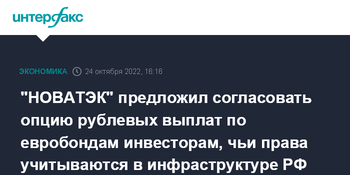 Москва. 24 октября. INTERFAX.RU - "НОВАТЭК" предложил держателям долларовых еврооблигаций с погашением в 2022 году согласовать возможность прямых выплат в рублях инвесторам, чьи права учитываются российскими депозитариями, сообщила компания-эмитент евробондов Novatek Finance DAC.