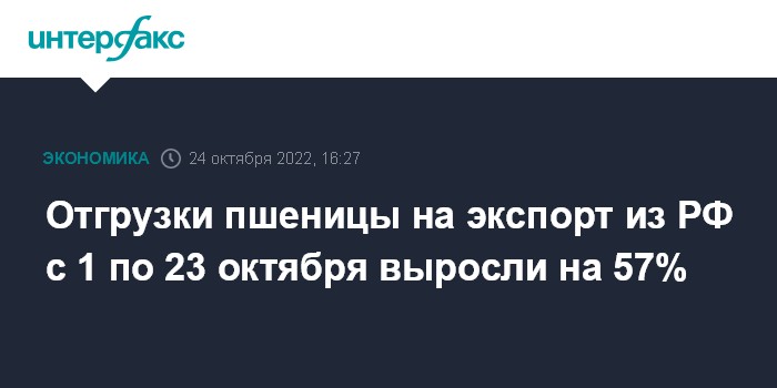 Москва. 24 октября. INTERFAX.RU - РФ с 1 по 23 октября отгрузила на экспорт 4,13 млн тонн пшеницы, что на 57% больше, чем за аналогичный период прошлого года. Об этом сообщила "Интерфаксу" директор аналитического департамента Российского зернового союза Елена Тюрина, напомнив, что год назад на экспорт было отправлено 2 млн 637 тыс. тонн пшеницы.