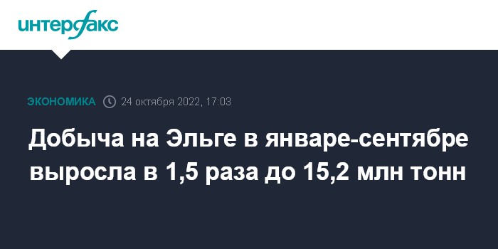 Москва. 24 октября. INTERFAX.RU - ООО "Эльгауголь" добыло на Эльгинском угольном проекте в январе-сентябре 2022 года 15,2 млн тонн, что на 48% больше, чем за аналогичный период прошлого года, сообщает УК "Элси" (управляющая компания проекта).