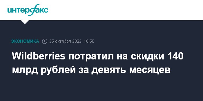 Москва. 25 октября. INTERFAX.RU - Онлайн-ритейлер Wildberries за девять месяцев 2022 года предоставил субсидии на товары в виде скидок на общую сумму 140,3 млрд рублей. Это на 19% больше аналогичного показателя за 2021 год, сообщила компания.