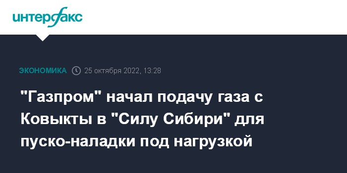 Москва. 25 октября. INTERFAX.RU - "Газпром" начал подачу газа с Ковыктинского месторождения в магистральный газопровод "Ковыкта - Чаянда" (часть газопроводной системы "Сила Сибири") для проведения пусконаладочных работ под нагрузкой, сообщила компания.