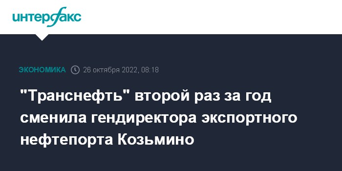 Москва. 26 октября. INTERFAX.RU - "Транснефть" сменила руководителя нефтяного порта Козьмино на Дальнем Востоке, через который российская нефть направляется в страны Азиатско-Тихоокеанского региона, сообщила пресс-служба порта.