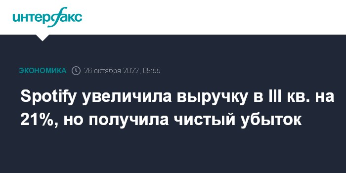 Москва. 26 октября. INTERFAX.RU - Шведская Spotify Technology, оператор одноименного музыкального стримингового сервиса, увеличила выручку в третьем квартале 2022 года на 21%, однако получила чистый убыток по сравнению с прибылью годом ранее.