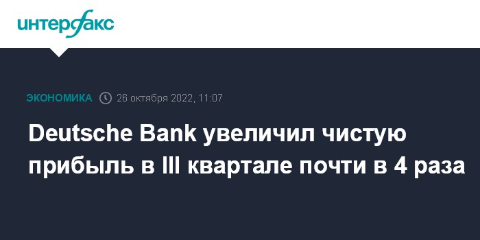 Москва. 26 октября. INTERFAX.RU - Deutsche Bank AG, крупнейший банк Германии, резко увеличил чистую прибыль и выручку в третьем квартале 2022 года, превзойдя ожидания аналитиков.