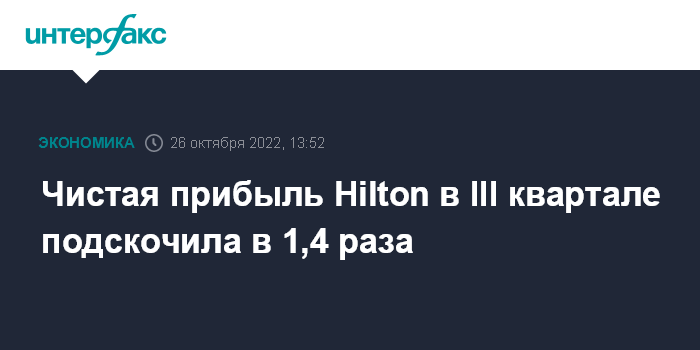 Москва. 26 октября. INTERFAX.RU - Американская гостиничная сеть Hilton Worldwide Holdings увеличила чистую прибыть в 1,4 раза в третьем квартале 2022 года, однако выручка не оправдала ожиданий рынка.