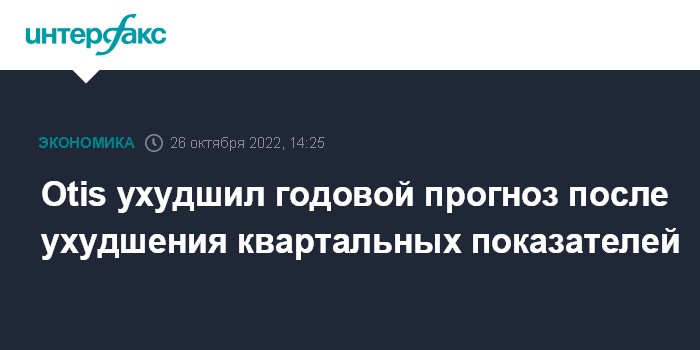 Москва. 26 октября. INTERFAX.RU - Производитель подъемного оборудования Otis Worldwide Corp. сократил чистую прибыль и выручку в третьем квартале 2022 года и снова ухудшил годовые прогнозы.