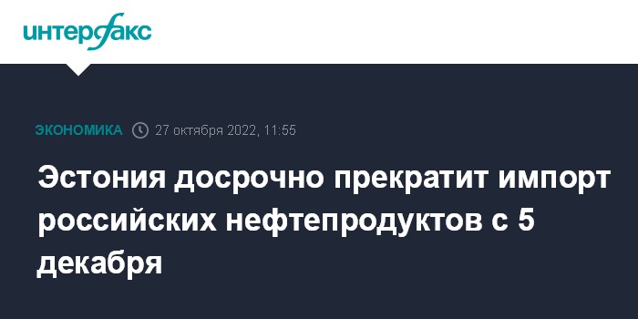 Москва. 27 октября. INTERFAX.RU - Правительство Эстонии приняло постановление, по которому прекращается весь импорт российских нефтепродуктов до завершения установленного Евросоюзом переходного периода и вводится запрет на его ввоз с 5 декабря.