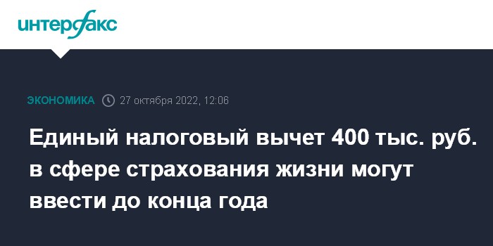 Москва. 27 октября. INTERFAX.RU - Единый налоговый вычет в размере 400 тыс. рублей до конца 2022 года может быть распространен на долгосрочные договоры страхования жизни, сообщил директор департамента финансовой политики Минфина РФ Иван Чебесков, выступая на Форуме лидеров страхового рынка в четверг.